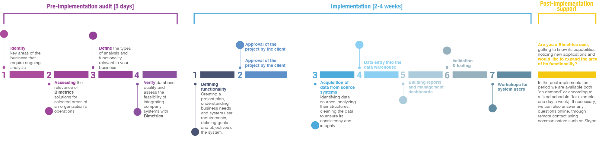 IT solutions should result from the previously defined business goals and required functionalities. Depending on the scale of the project and selected modules, BImetrics implementation time ranges from 2 to 4 weeks, with minimal involvement of company employees, limiting their participation to providing access to databases.